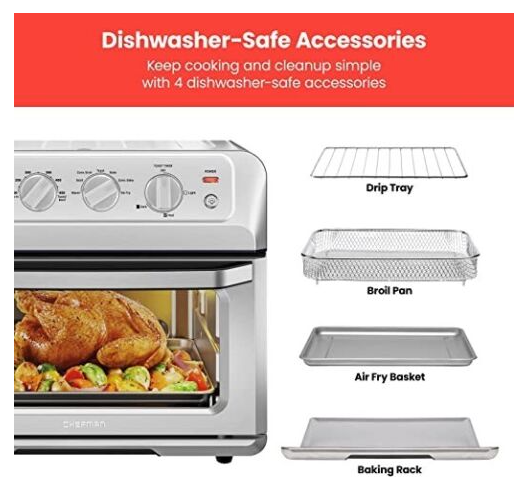 • ACCESSORIES INCLUDED: Dishwasher-safe baking rack, air fry basket, and broil pan are included, so you have everything you need to get cooking