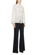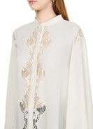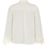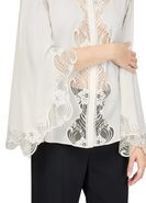 Description: Floral embroidery, high-neck, mandarin collar, bell sleeve, long-sleeved, button fastening, lace details.