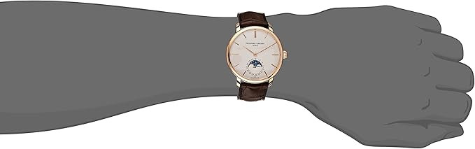 18K rose gold watch with round white dial, small moon/day dial and bar hour markers.