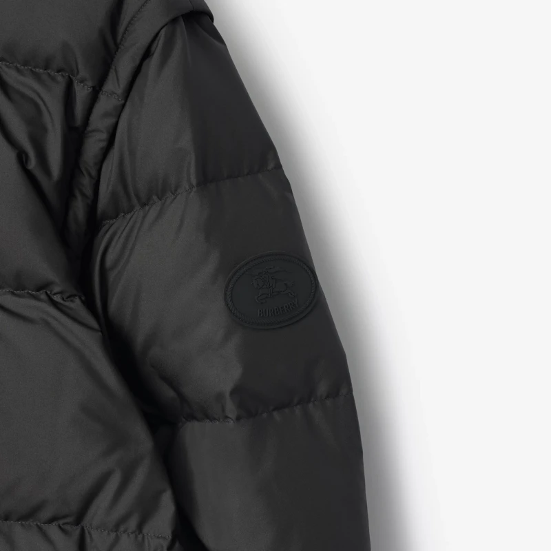 Down jacket, filled with goose down and insulating fibers. Adorned with the brand's knight's stamp appliqué, inspired by archival patterns from the 1980s. Features detachable sleeves, allowing for versatile transitions between jacket and vest styles. Offers a relaxed fit with a detachable hood and collar, lined with a wool lining accented with Burberry check.