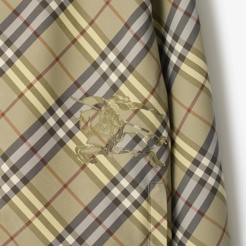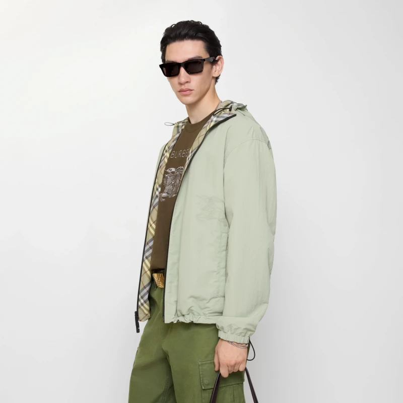 Lightweight coat made of twill fabric. With a drawstring hood, it presents a loose version. Double-faced and double-worn style, one side is decorated with Burberry plaid, and the other side is pure green nylon fabric decorated with the same color equestrian knight logo (EKD) decal.