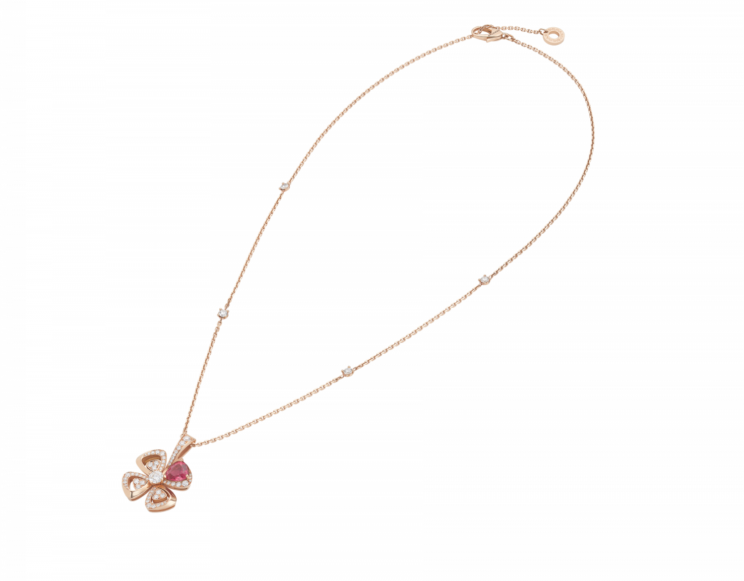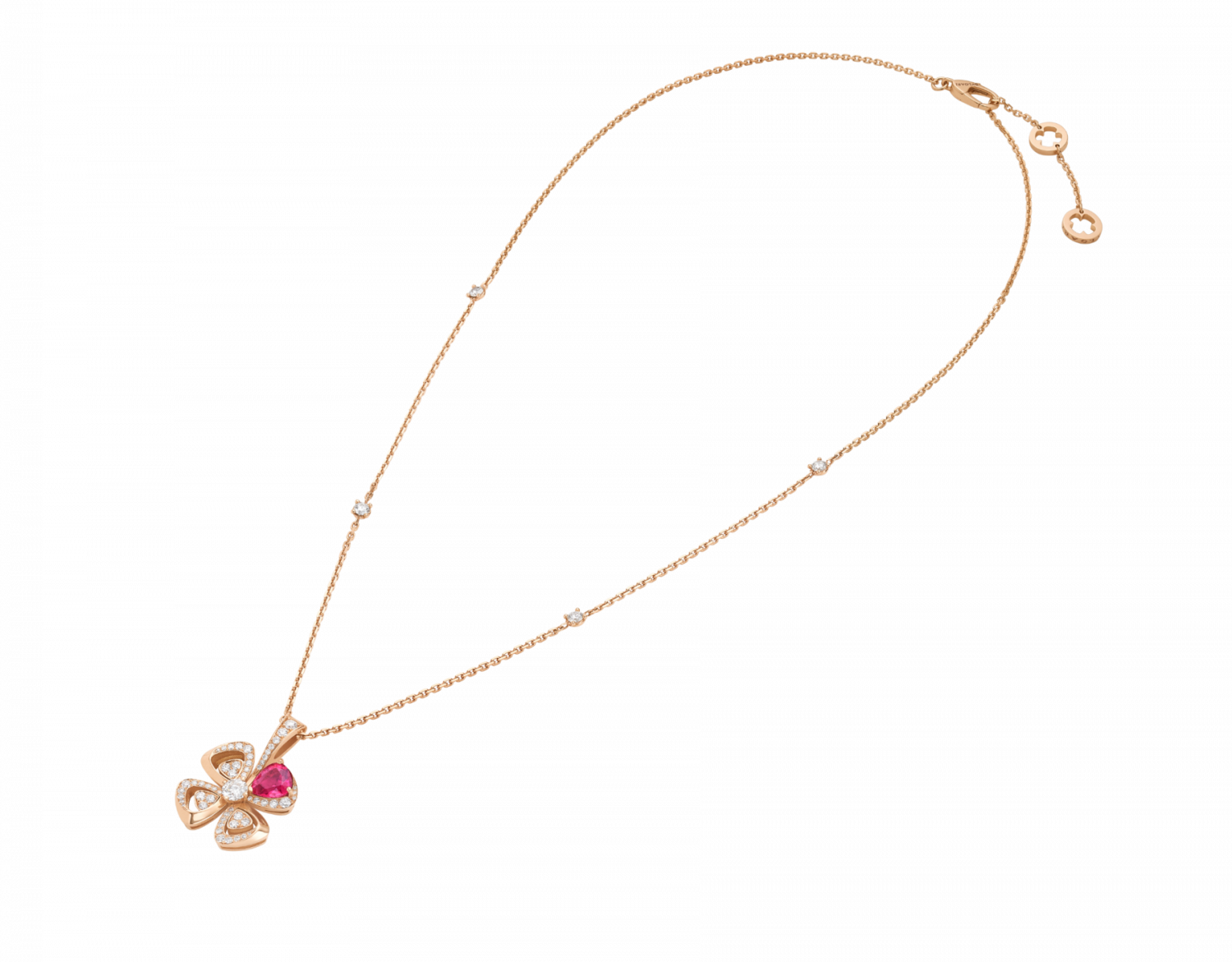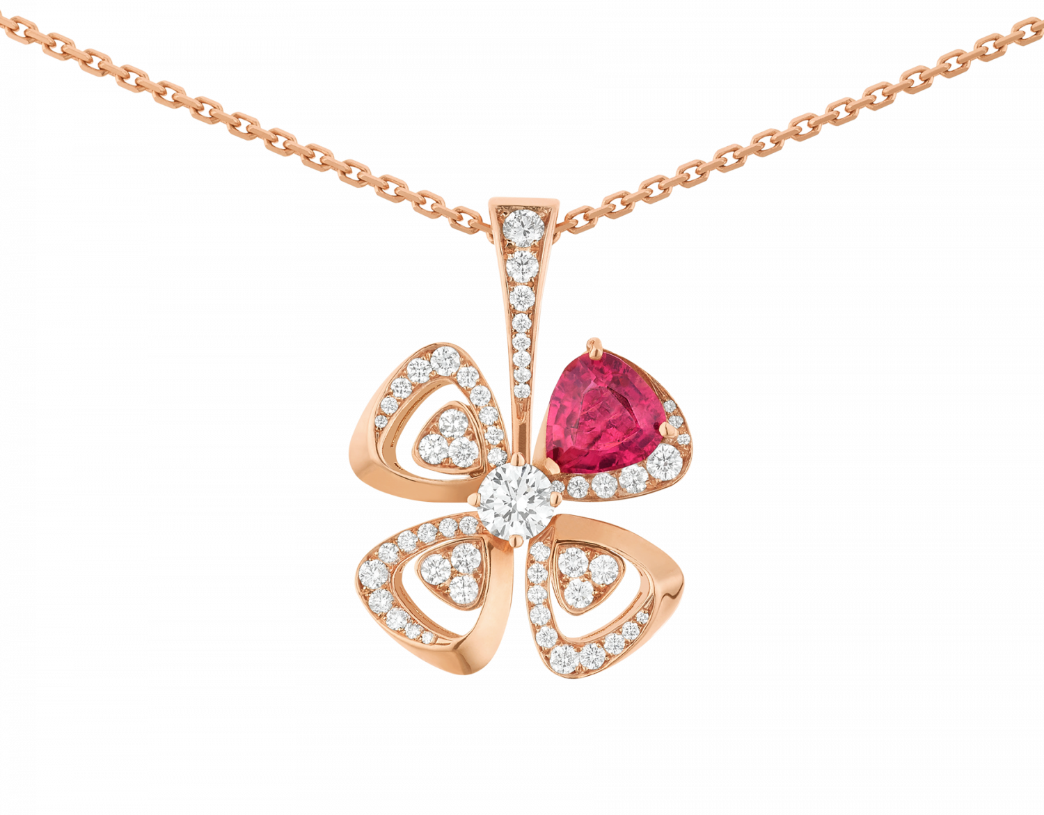Fiorever's 18K rose gold necklace depicts the exquisite corolla with gorgeous gems, and draws design inspiration from the charming four-petal flower cherished by the Romans, which is a symbol of happiness and joy. The floral pattern presents the iconic color of Bvlgari Bulgari, and is decorated with precious diamonds that exude meaningful elegance. The ruby petals skillfully blend deep texture, exquisite shape and bright light.