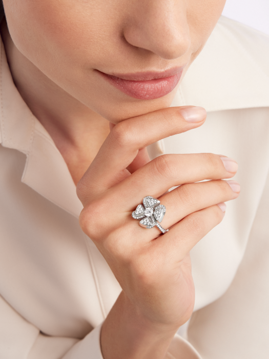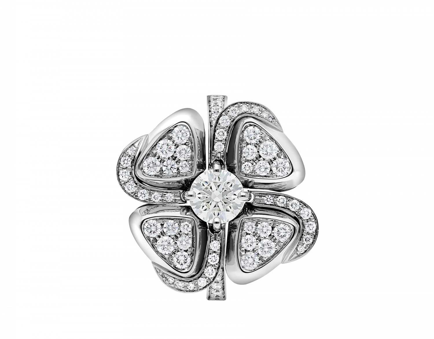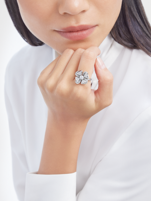 Fiorever's chant series blooms beautifully in Rome, the eternal city, and draws design inspiration from the charming four-petal flowers cherished by the Romans, which are symbols of happiness and joy. Fiorever is composed of two words with rich meanings: Fiore (Italian for flowers) and forever (English for eternity), which eulogizes the Roman love for life with passionate and amazing designs. Bvlgari Bulgari highlights the rich and colorful beauty of nature with precious floral patterns. Four platinum diamond petals surround a central diamond, and they shine brilliantly. Fiorever Yong Zhan series ring, white 18K gold material, set with a diamond, decorated with pavé diamonds.