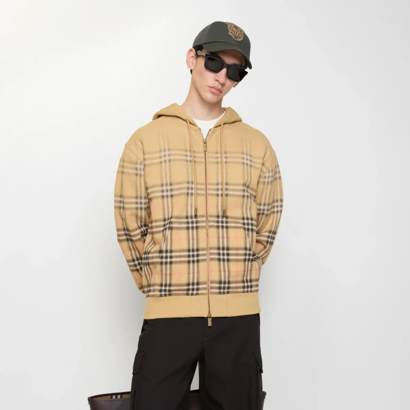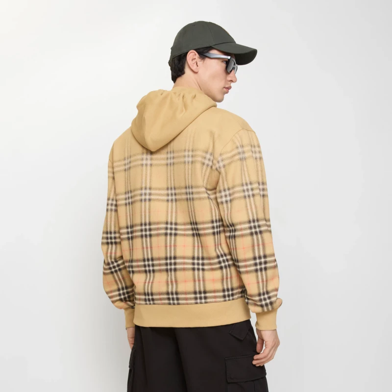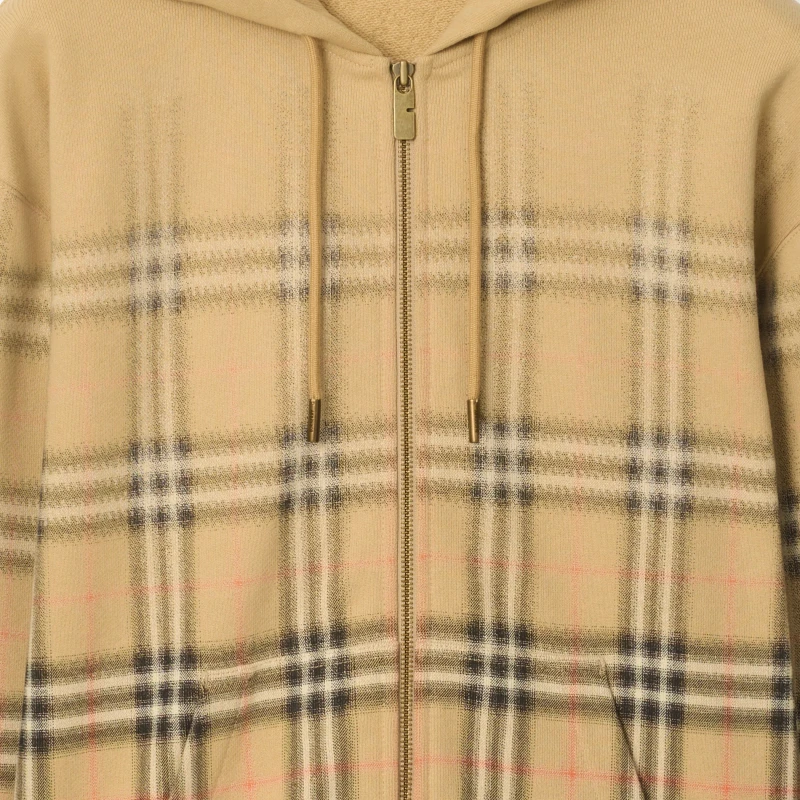 Zip-up hoodie crafted from lightweight fleece cotton. Features a creative gradient print that subtly blends Burberry checks with solid colors. Offers a relaxed fit and is adorned with vintage-inspired metal hardware.