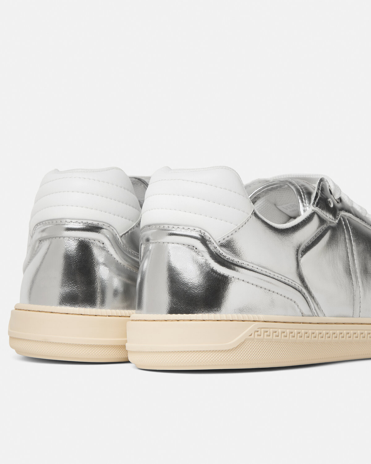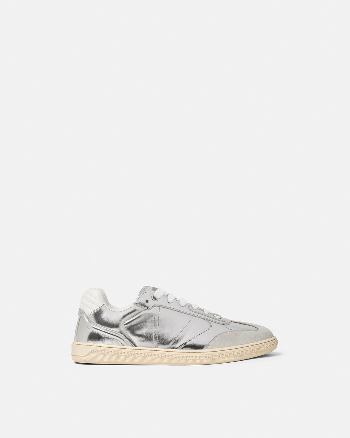 Low-top sneaker, made of metallic laminated leather, with suede inlay, thin Greca sole and Versace Logo patch on the tongue. Greca Court sneakers are made of environmentally-friendly materials certified by recycled ingredients or/and derived from renewable raw materials.