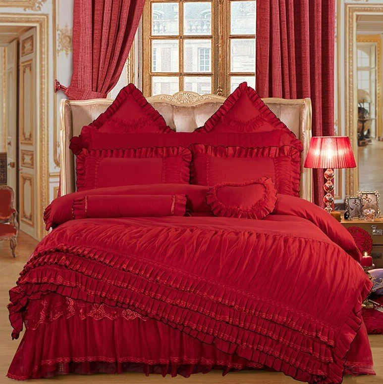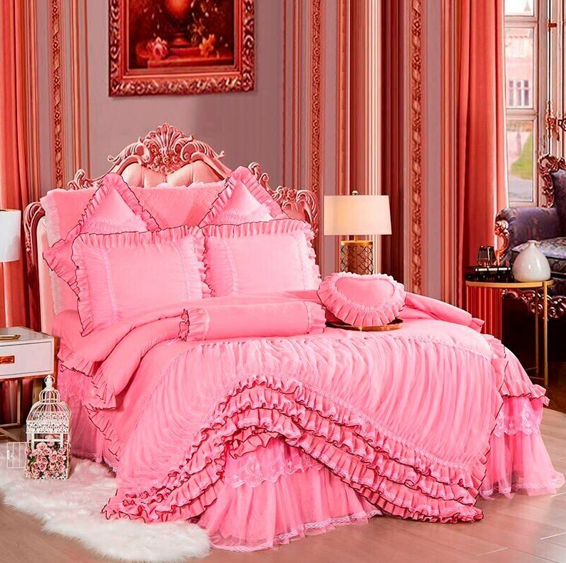 Layers Ruffles Lace Princess Pink Wedding Bedding Set Duvet Cover Bed Skirt NEW
