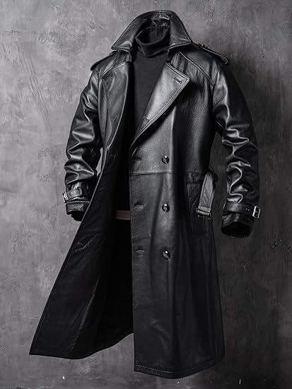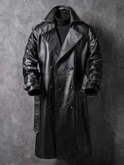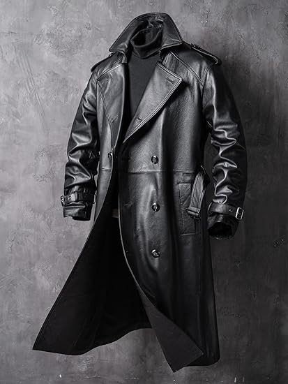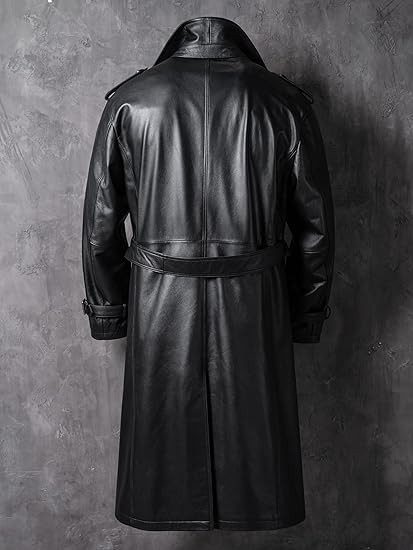 Men's leather windbreaker, medium and long double-breasted belt, leather jacket.