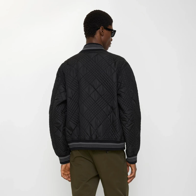 This flight jacket is crafted from a lightweight, shimmering nylon blend. Inspired by the brand's archival archives, the fabric incorporates contrasting fine-spun yarns to create an iridescent effect. The Rakewood style is accented with mini check stitching, a quilted detail that reinterprets the brand's iconic element. A striped hem with a knitted Equestrian Knight Logo (EKD) presents a regular fit.