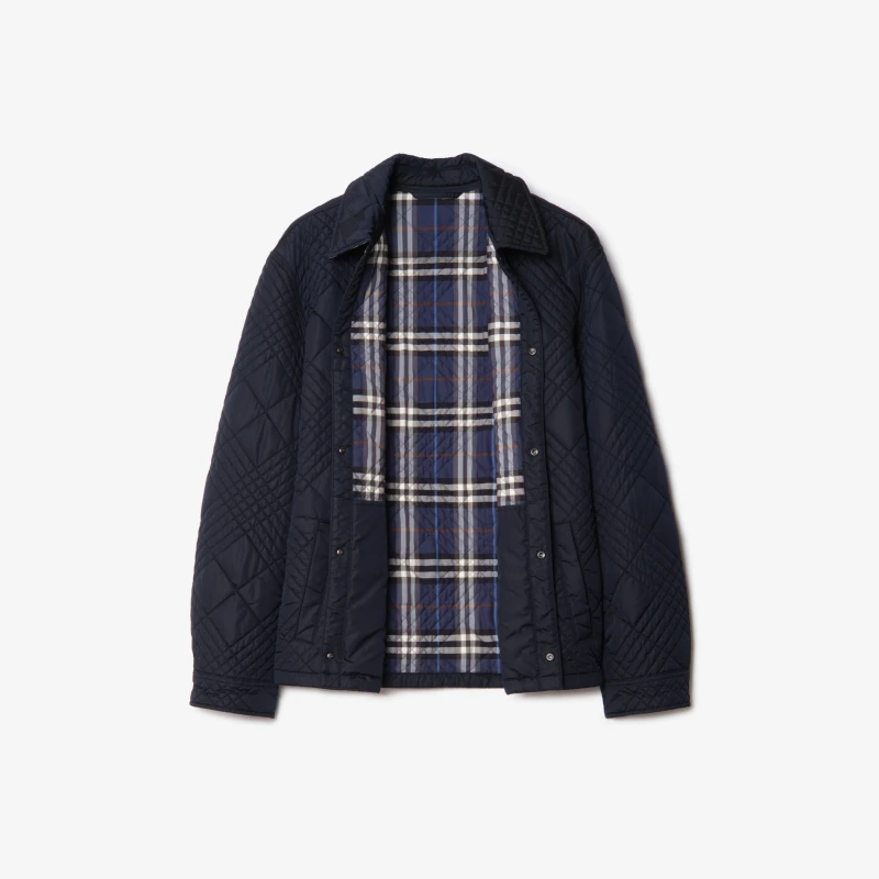 Jacket crafted from a lightweight, iridescent nylon blend. Inspired by the brand's archival archives, the fabric incorporates contrasting fine yarns to create a shimmering effect. The Ramsey style is accented with mini check stitching, a quilted detail that reinterprets the brand's iconic element. It features a regular fit with a clean pointed collar adorned with tonal Equestrian Knight's Logo (EKD) embroidery. Features a Burberry check lining in a tonal aviary blue color.