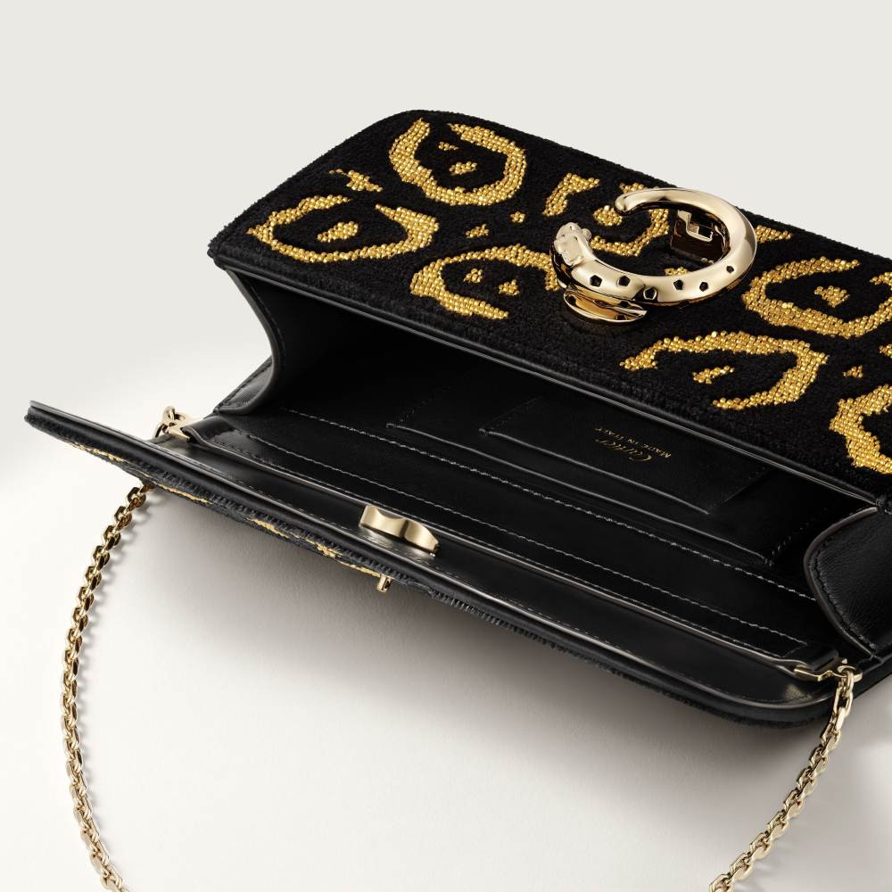 Panthère C de Cartier mini chain handbag, black tufted, embroidered gold beads, cheetah pattern, black enamel and gold-plated bread buttons, and gold "Cartier" logo on the inside. 1 inner compartment, 1 flat pocket and 1 logo pocket. The back of the handbag is provided with an outer flat bag. Lining: black lambskin. Detachable chain. Size: height: 100mm. Length: 200mm. Depth: 45 mm. Can be carried by hand or slung sideways.