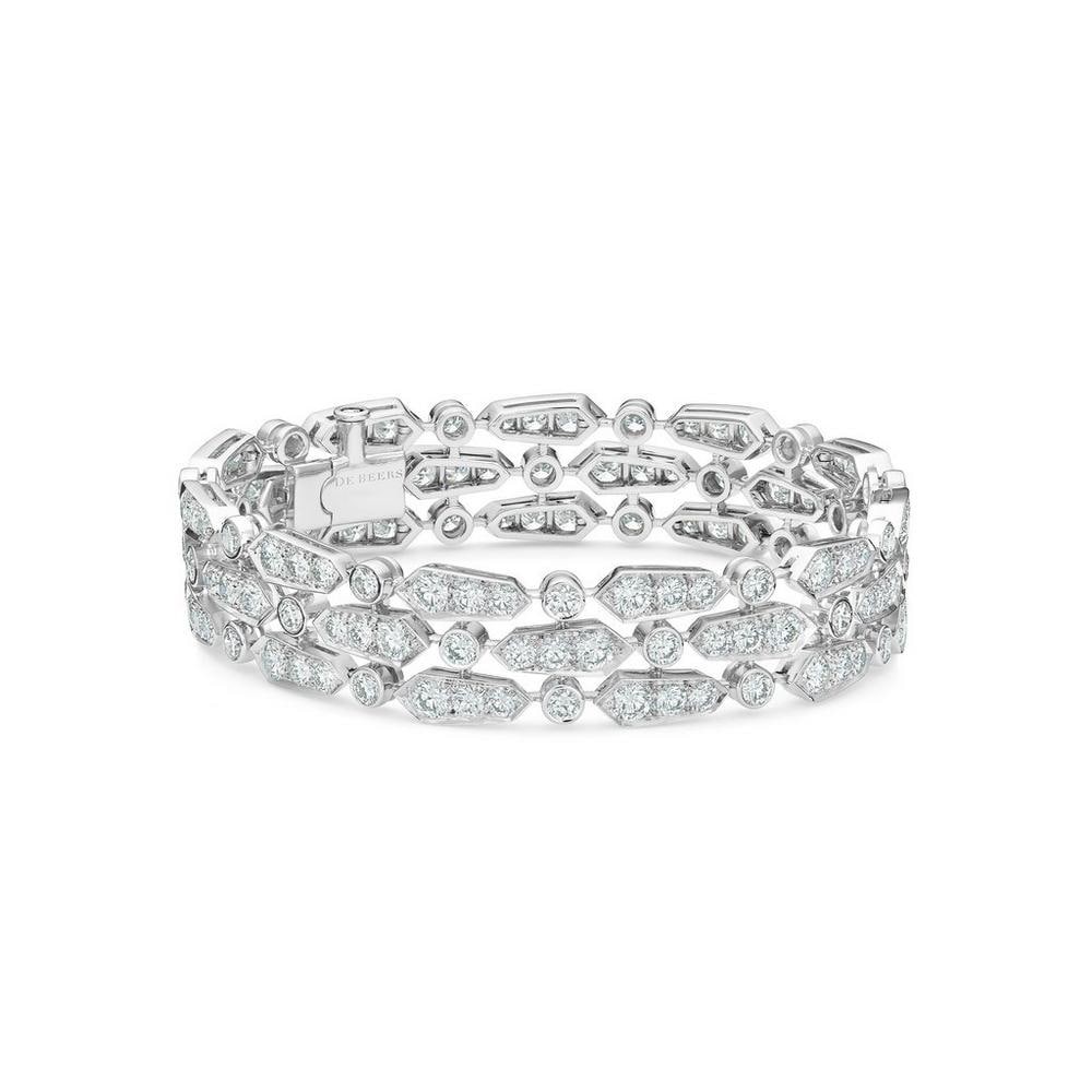 This 18K white gold diamond bracelet celebrates the majestic beauty of glaciers. Our diamond jewelry designs reflect natural phenomena, and diamonds themselves are natural phenomena. The design consists of three alternating circles of bezel-set and pavé-set round brilliant-cut diamonds. Each diamond selected is ethically sourced, carefully selected one by one according to the standards of fire, vitality and brilliance, and hand-set by De Beers’ team of diamond experts with over 130 years of professional experience. This diamond bracelet is as elegant as the one who wears it. .