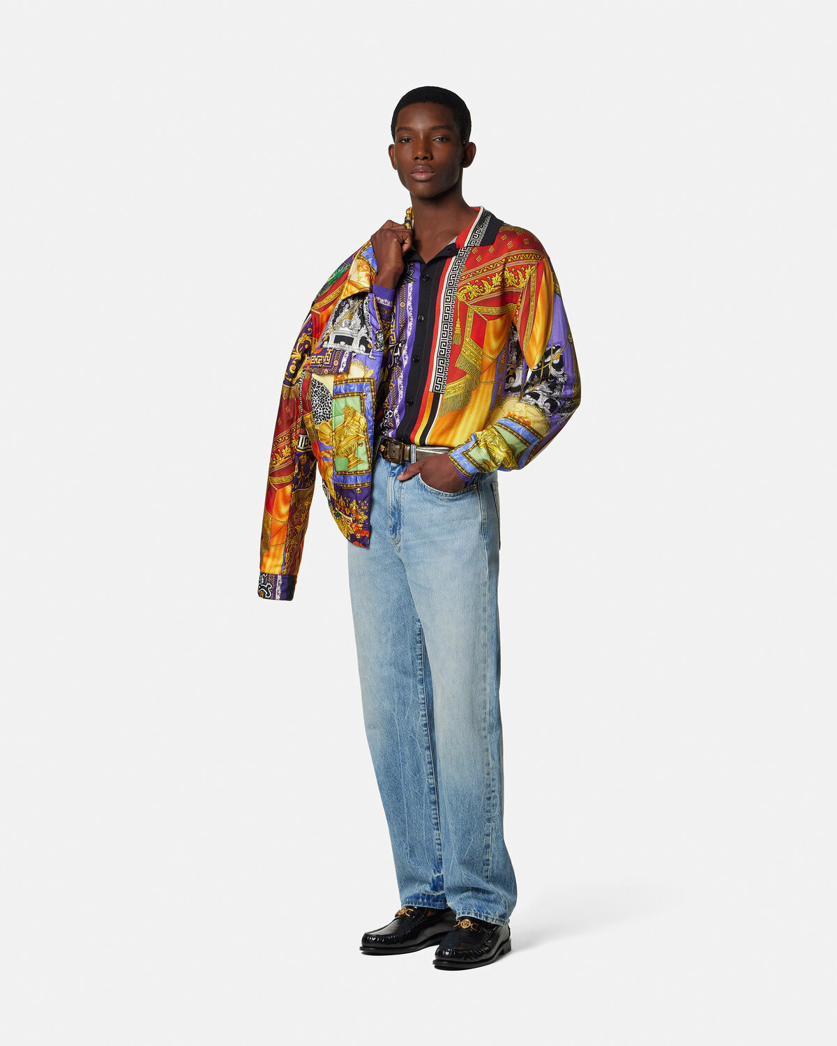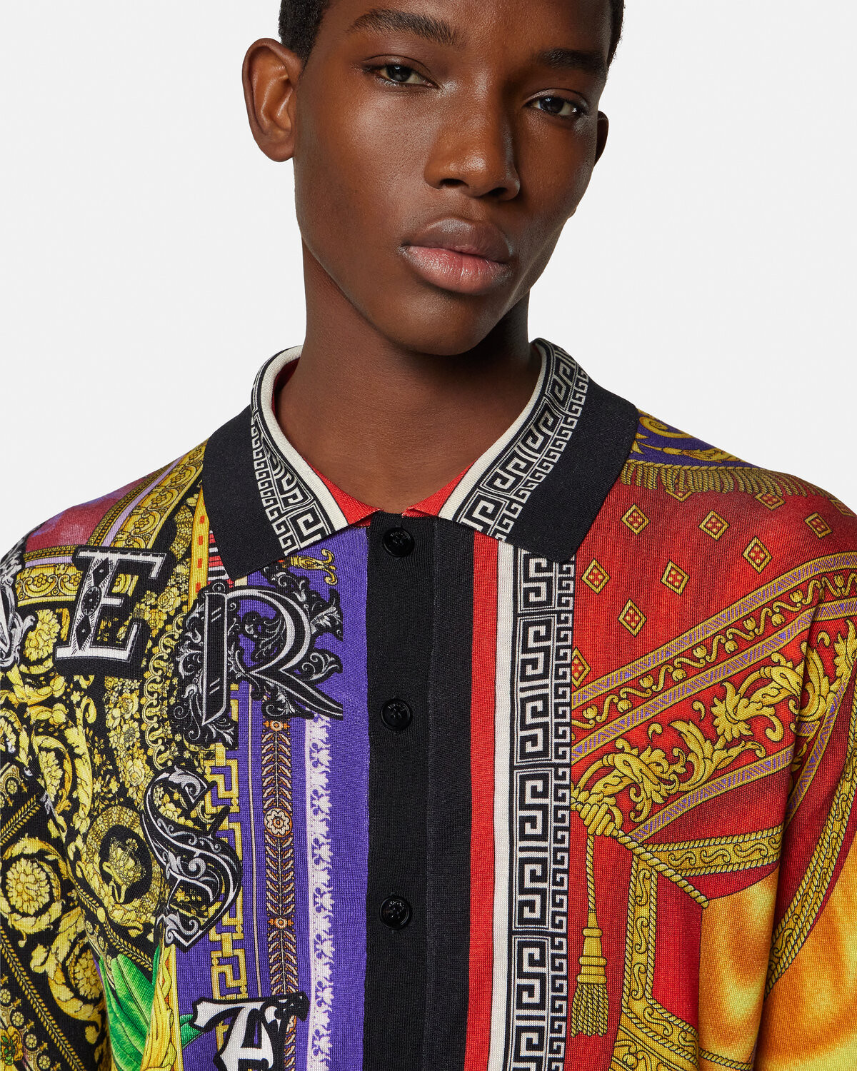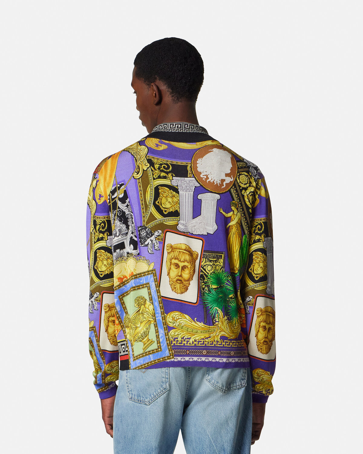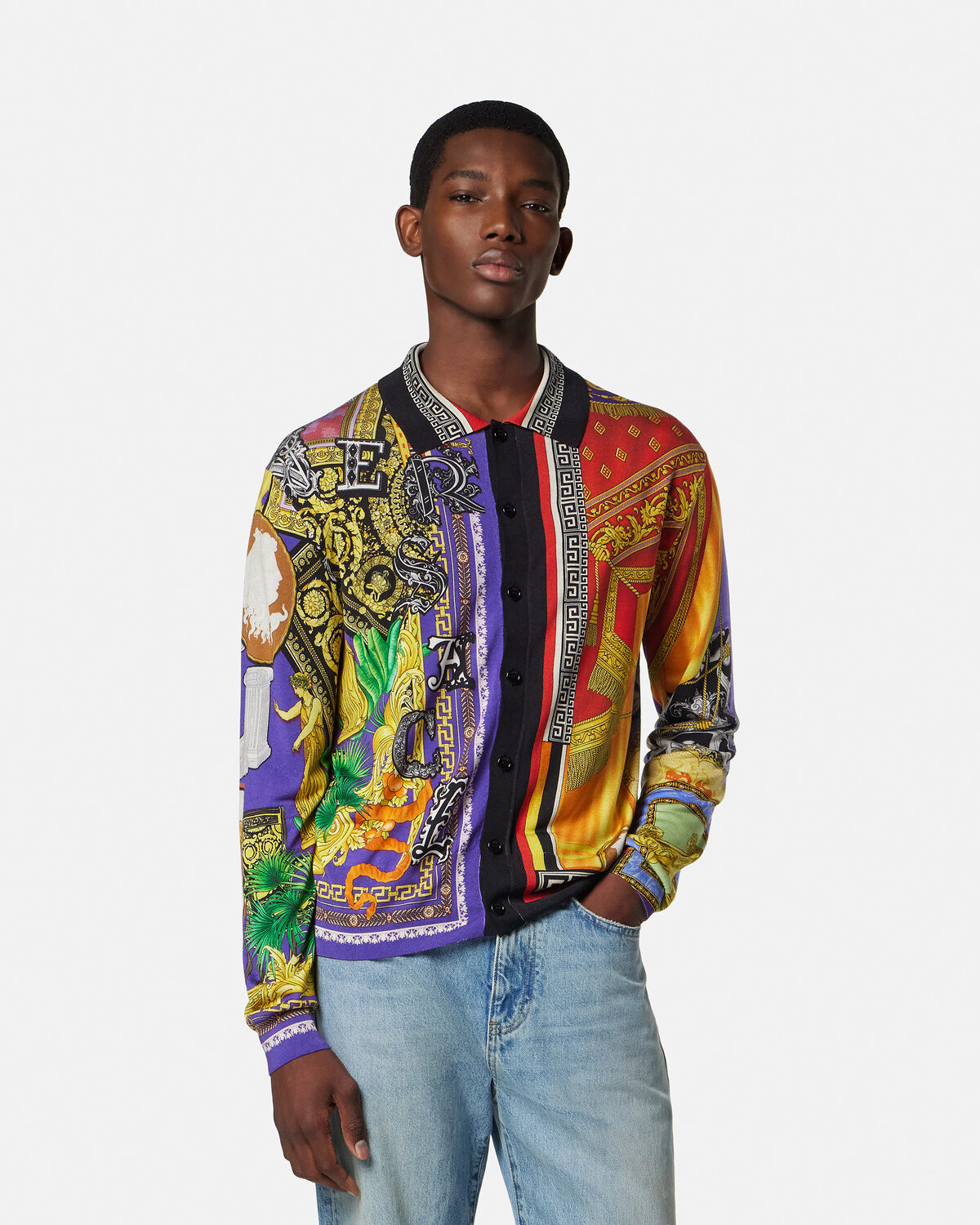 This lightweight silk knit shirt has a slim fit and Versace Patchwork print, which shows the collage effect of the brand's classic print.