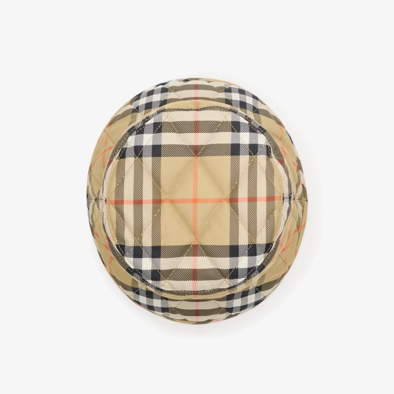 This Horseshoe bucket hat draws inspiration from the elegance of the English countryside. Crafted from quilted nylon with a fine-woven Burberry check pattern, it's presented in the iconic beige. It incorporates a tonal leather equestrian patch, a classic motif from the brand's 1980s bags.
