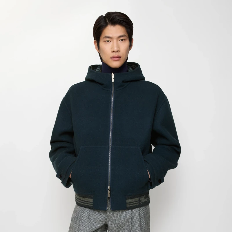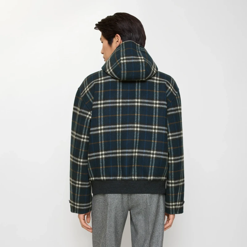 Hooded jacket, crafted from double-faced wool twill. Features a brushed finish for a soft touch. A versatile style, meticulously crafted in Italian workshops. The reverse side is adorned with the Burberry check pattern, presented in the new season's aviation blue, offering a classic fit. Ribbed knit details create a refined hem.