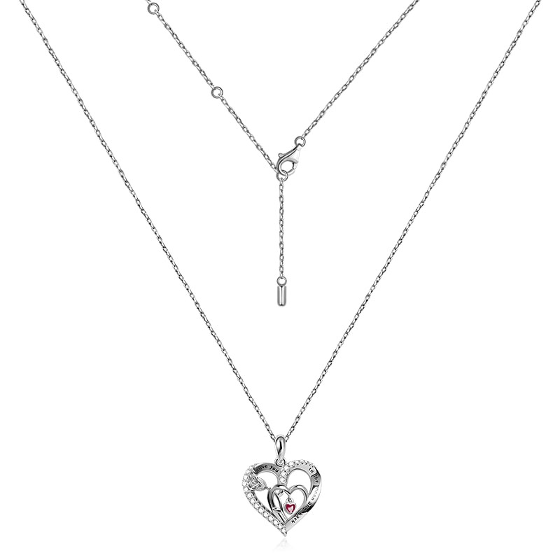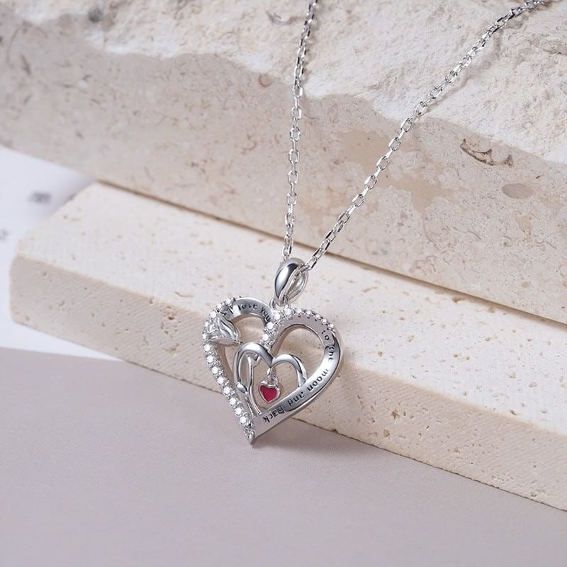 Three hearts are connected by a rose. The largest heart is engraved with the words "I love you to the moon" and is inlaid with crystal gems. The small heart pendant is made of ruby corundum. This is a great gift for your loved ones.