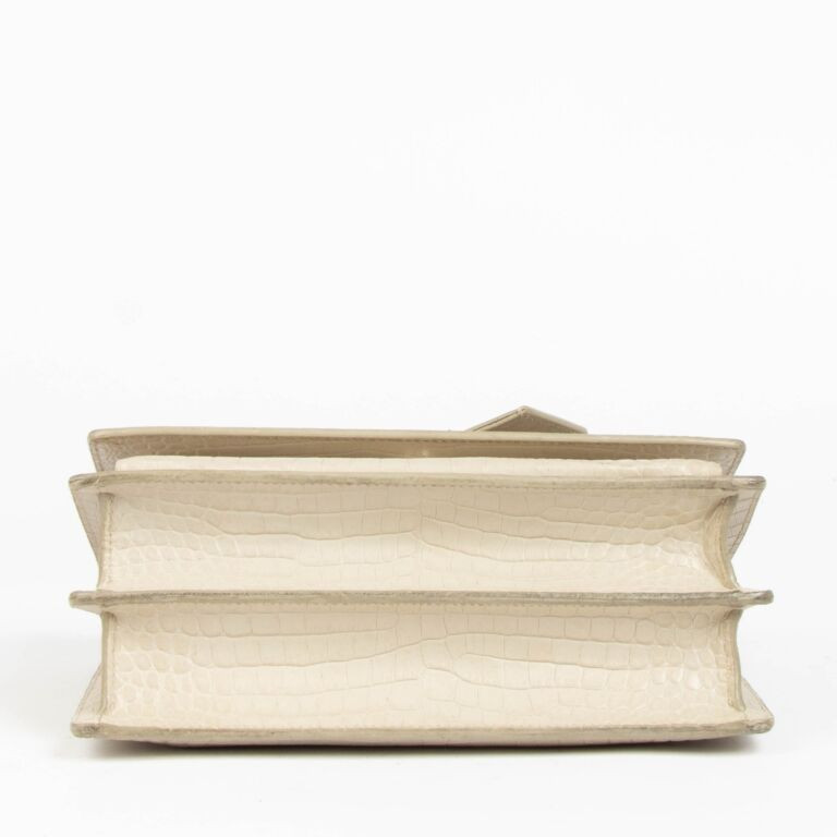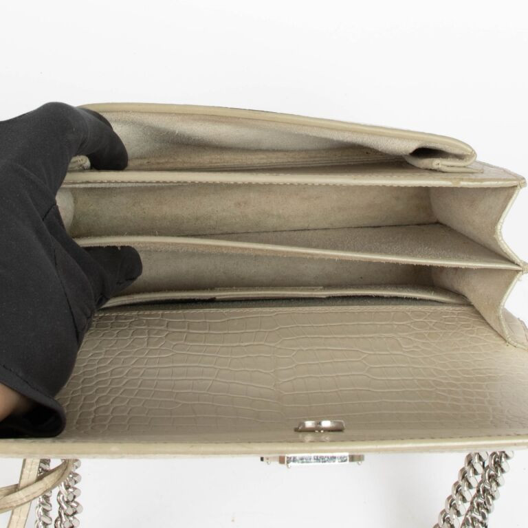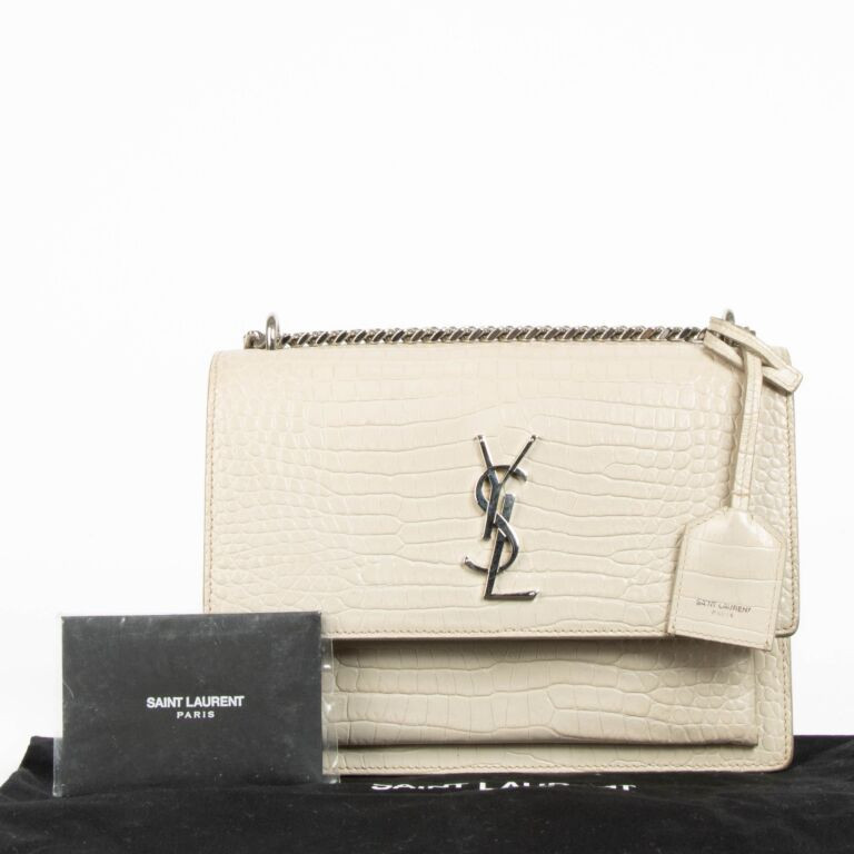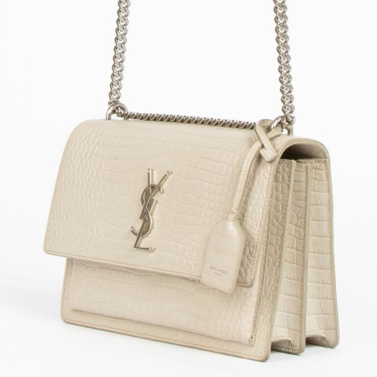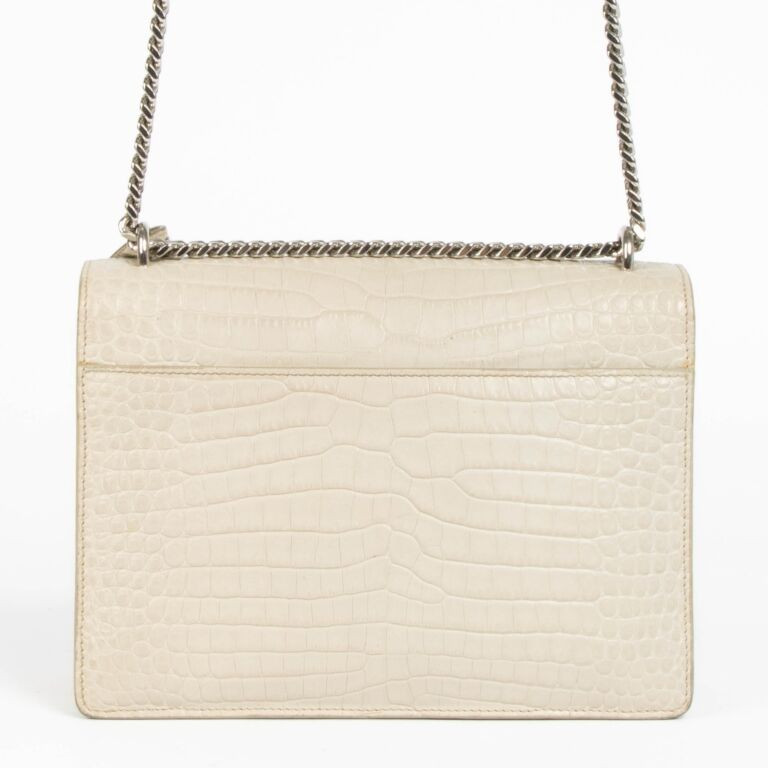 Elegant and effortlessly modern, the Saint Laurent Beige Crocodile Embossed Medium Sunset Bag showcases the refined aesthetic of Saint Laurent. Crafted in glossy crocodile-embossed leather, this structured shoulder bag features the iconic YSL monogram, a sliding chain strap for versatile styling, and a compact yet practical interior. Its soft beige tone adds a sophisticated, timeless touch to any look.