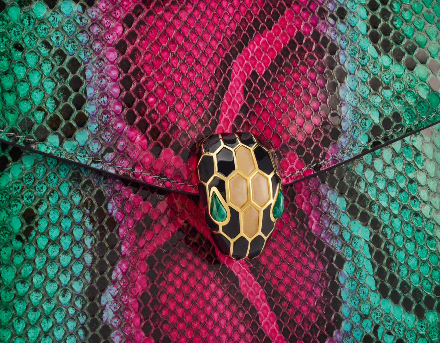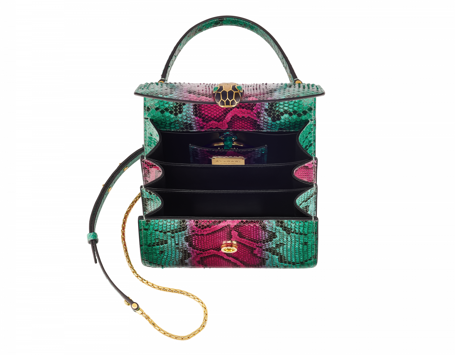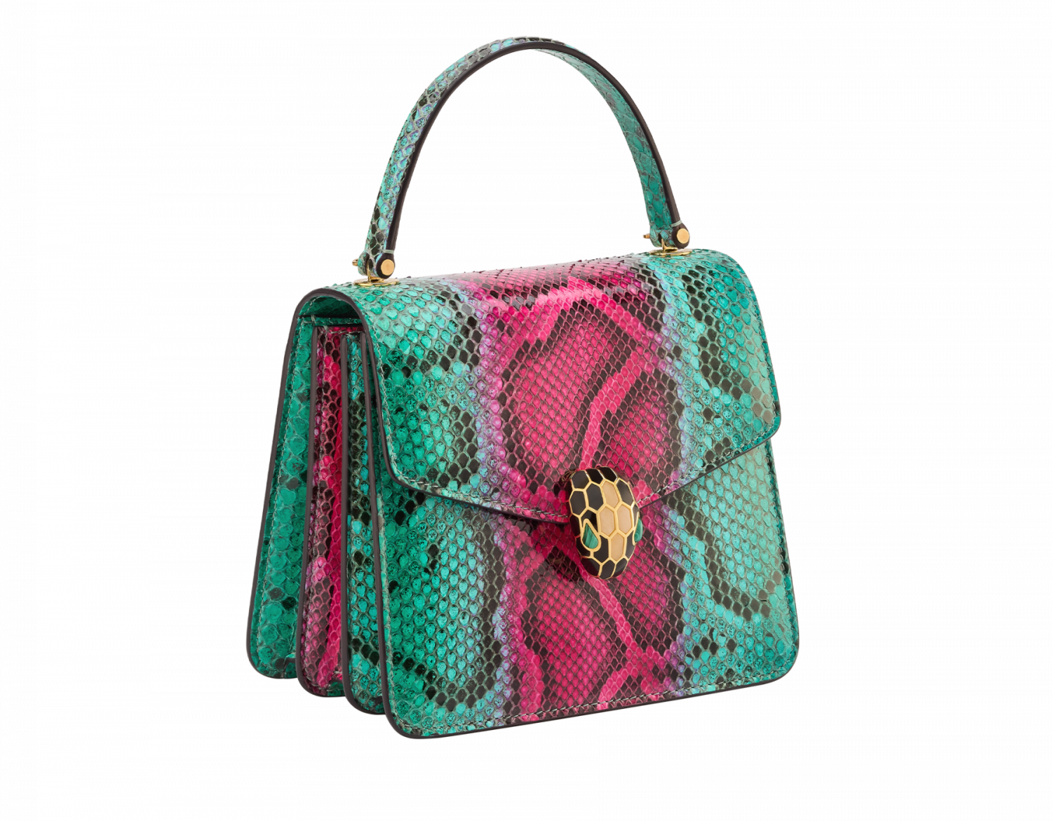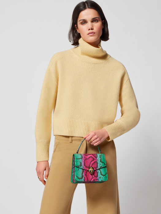 Serpenti Forever series small handbags are hand-refined and colored with bright green emerald and pure tourmaline rose-red colorful python skin, ingeniously combined with unique patterns and color changes, and blended with exquisite materials and modern styles to show changeable charm. The work is matched with snake chain and leather shoulder strap, and is decorated with the iconic snake head magnetic buckle. Its charming scales and design are inspired by Serpenti series jewelry in the 1960s. There are three compartments, an external splicing pocket on the back, an internal open pocket, a mirror bag with a customized cosmetic mirror, an inner metal nameplate engraved with Bvlgari brand logo, and a Bvlgari metal logo on the back. 18.5x16x10.5cm-7.3 x 6.3 x 4.1 inches. Made in Italy.
