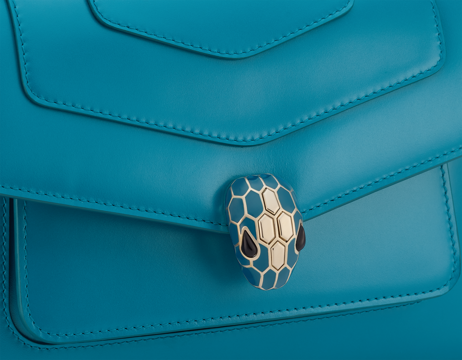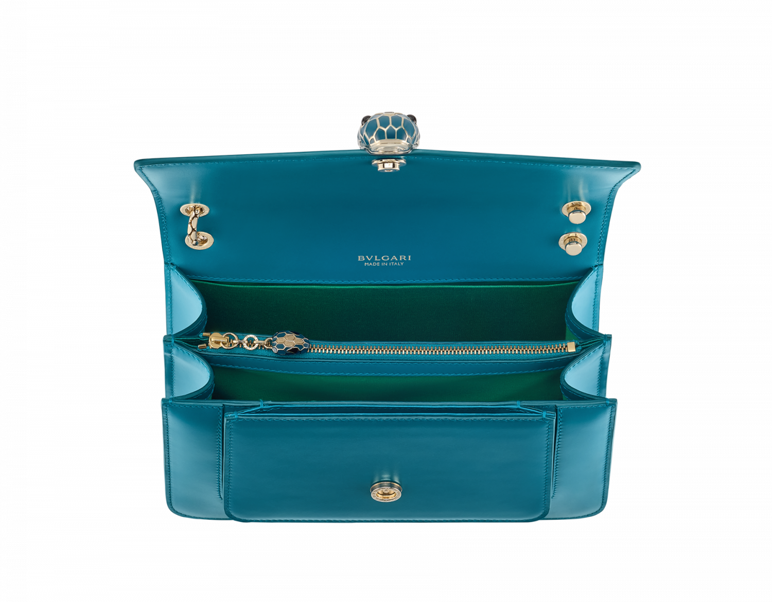 Serpenti Forever series medium shoulder bag, made of Laguna blue calf leather, skillfully blends urban atmosphere with changeable charm. The work is matched with a snake-shaped chain shoulder strap, decorated with an iconic snake head magnetic buckle, and its charming scales and design are inspired by Serpenti jewelry in the 1960s. There are two compartments, front and back splicing pockets, a separated zipper inner pocket and an open pocket. One side can customize the cosmetic mirror, and the back is decorated with Bvlgari metal logo. 25 x 16.5 x 8 cm-9.8 x 6.5 x 3.1 inches. Made in Italy.