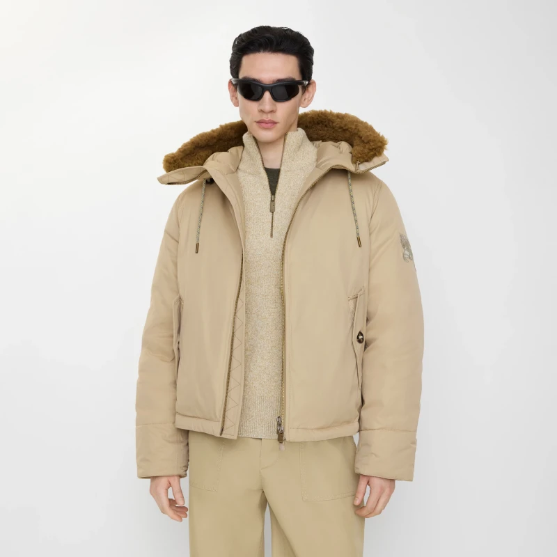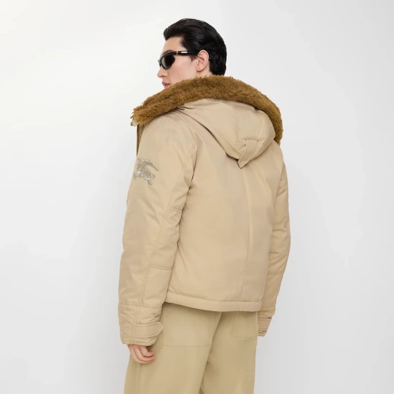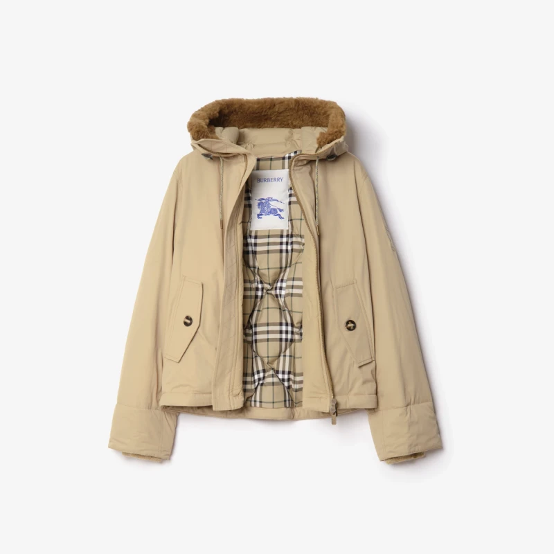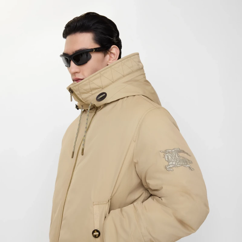 Hooded jacket crafted from cotton-nylon gabardine. A washed finish gives it a soft texture, and it's filled with goose down and feathers. This piece is from the gabardine capsule collection, paying homage to Burberry's century-long heritage of its iconic fabric. Gabardine, pioneered by founder Thomas Burberry, is suitable for both outdoor adventures and everyday wear. The Burberry check lining features a custom-designed tag inspired by the brand's archival advertising campaigns. It offers a relaxed fit and features a detachable lambskin trim on the hood, adorned with an embroidered Equestrian Knight's Logo (EKD).