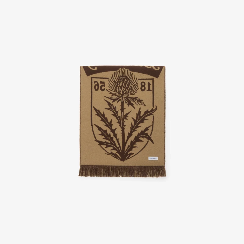 Product Description: This scarf, crafted in Italian workshops from premium wool, features a new season's fine-woven pattern incorporating the brand's signature cursive logo. Inspired by sporty scarves, it cleverly blends exquisite elements such as the thistle shield, stripes, and the founding year of Burberry.